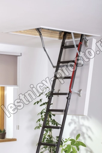 Лестница обладает повышенной теплоизоляцией и низкими показателями воздухопроницаемости крышки. Облегченная крышка люка изготовлена из пенополистирола без применения дополнительных деревянных элементов. Наконечники имеют возможность регулировки, что позволяет подогнать длину лестницы по высоте помещения в случае излишнего подрезания лестницы или изменения толщины пола.