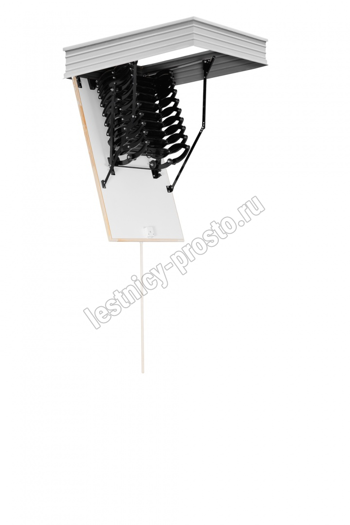 Все элементы лестницы выполнены из экологически чистых материалов и обработаны веществами, не содержащими тяжелых металлов. На ступенях антискользящие насечки. Короб лестницы изготовлен из металла. Термоизоляционная крышка типа "сэндвич" утеплена пенопластом, облицована с двух сторон ДСП белого цвета. Короб люка с уплотнителем. В комплекте деревянный стержень для открывания лестницы.