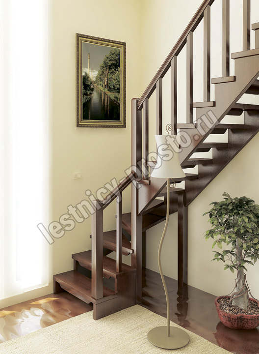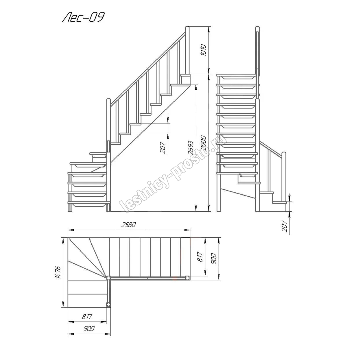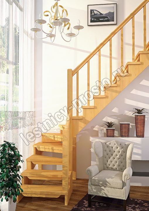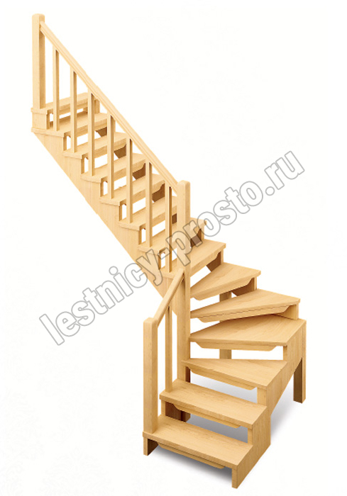 Лестница изготовлена из древесины хвойных пород. Базовый комплект включает в себя деревянные элементы лестницы и ограждения без какого-либо покрытия. Поставляется в разобранном виде, упакованная в ящик. Монтаж производится силами двух человек, в соответствии с указаниями, приведёнными в паспорте лестницы.