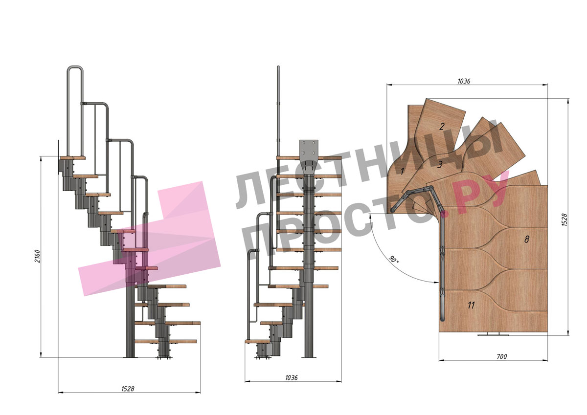 Лестница Prosto Urban White гусиный шаг 700 мм, h198-288 см (11 ступеней), бук