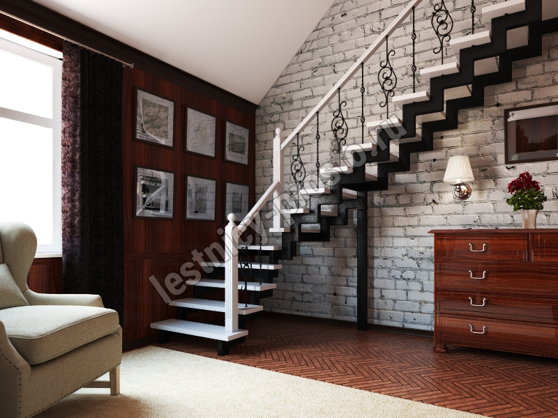 У данного варианта лестницы поворот реализован через забежные ступени. Под заказ возможно изготовление каркаса под поворотную площадку.
