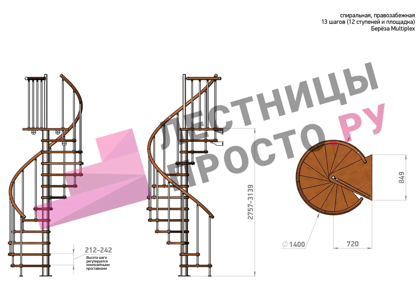 Высота ступеней регулируется с шагом 3 мм. в пределах 212-242 мм., благодаря чему, лестница прекрасно подгоняется под необходимую высоту.