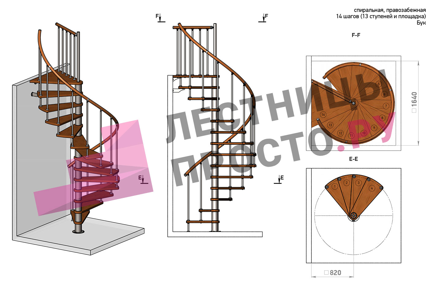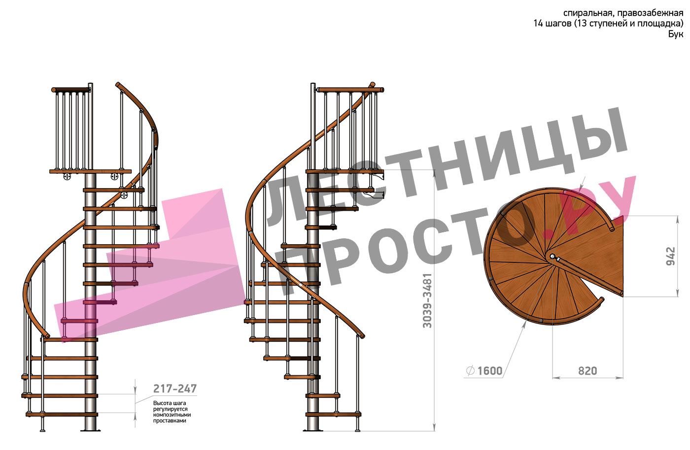 Ширина ступени между центральной колонной и поручнем ≈ 680 мм