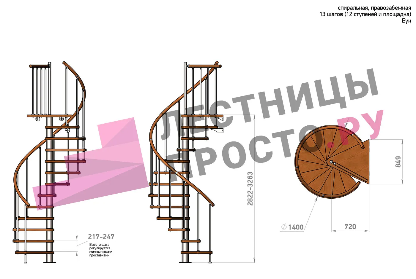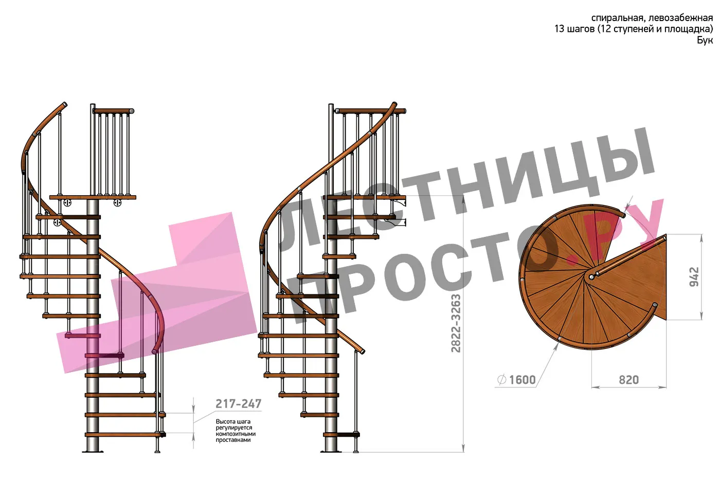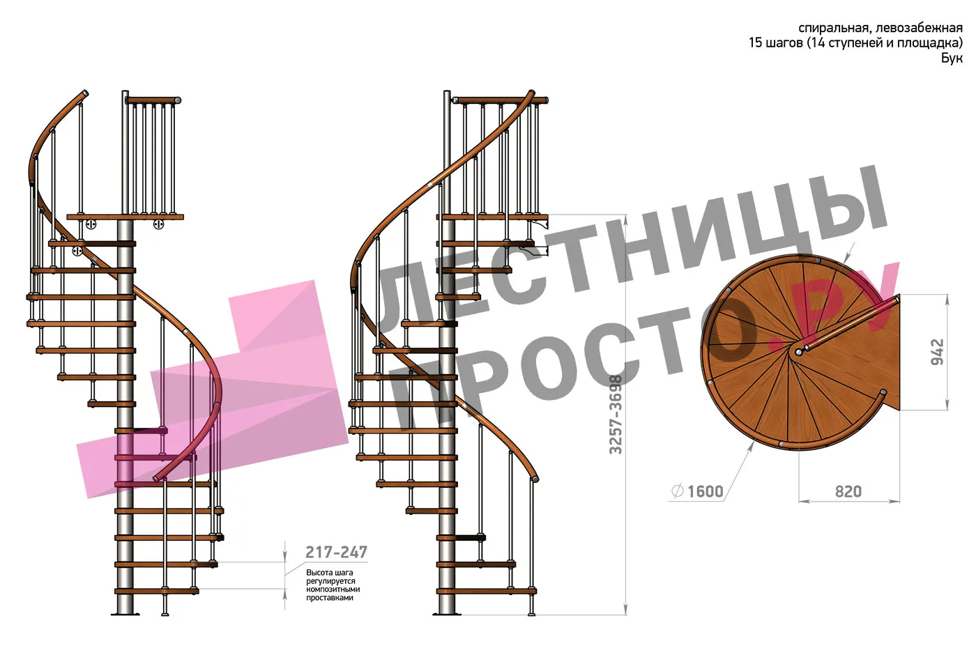 Высота ступеней регулируется с шагом 3 мм. в пределах 217-247 мм., благодаря чему, лестница прекрасно подгоняется под необходимую высоту.