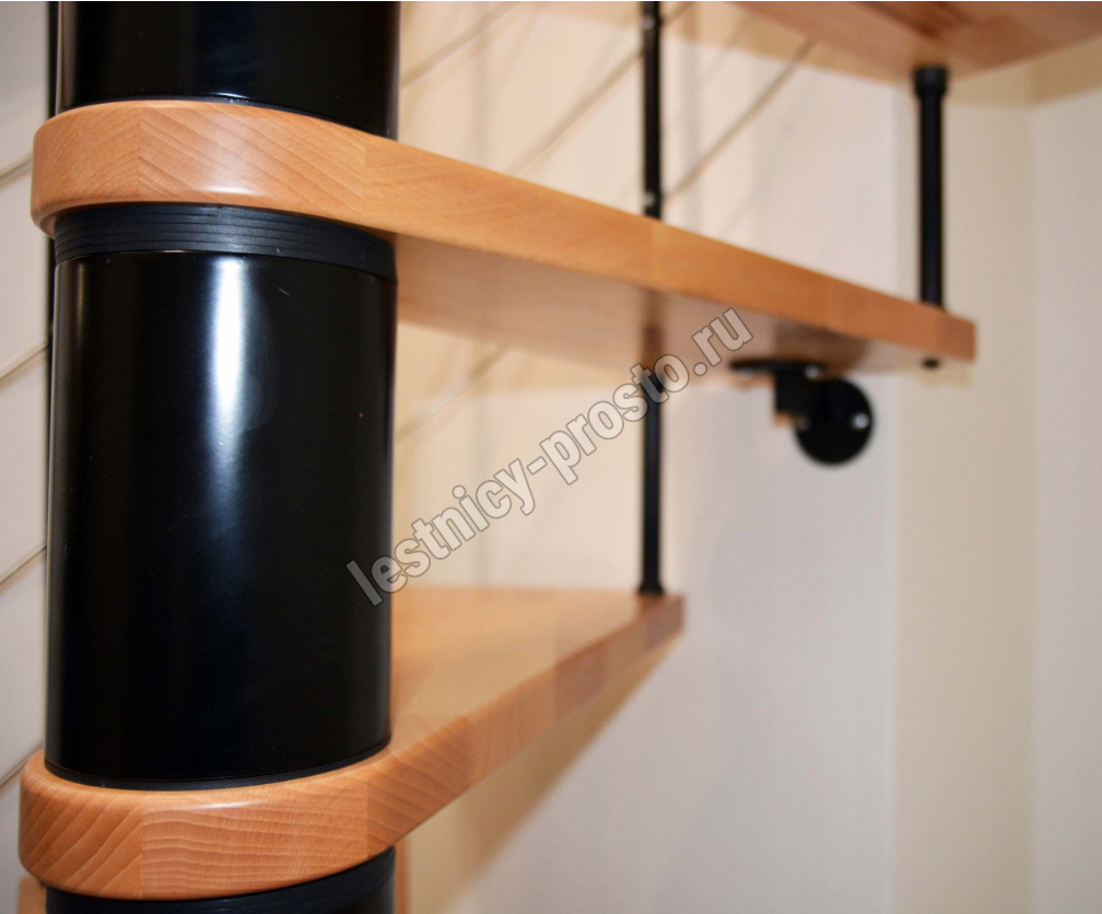 Cтупени и поручень изготовлены из массива дерева и покрыты специальным лаком от компании Минка, который предотвращает царапины, сколы или стирание поверхности при интенсивном использовании лестницы. Благодаря возможности регулировать высоту шага с помощью пластиковых вставок (входят в базовый комплект), высоту лестницы можно варьировать в пределах от 2860 до 3090 мм. Кроме того, купив дополнительную секцию для этой лестницы, можно поднять высоту до 3320 мм.