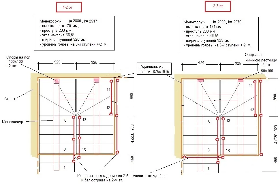 Поворот на 180°, забежные ступени, лестница с 1 на 3 эт.